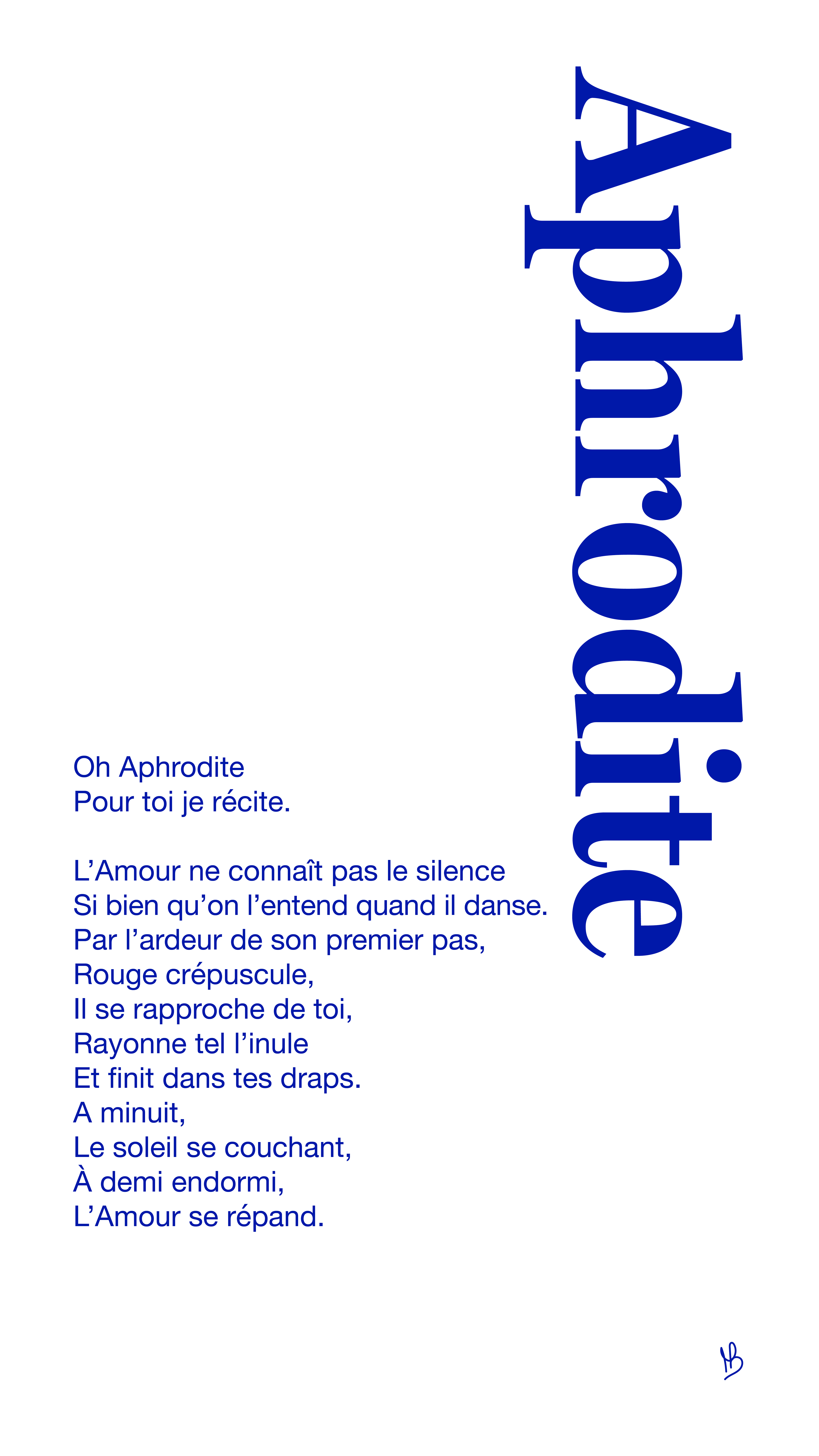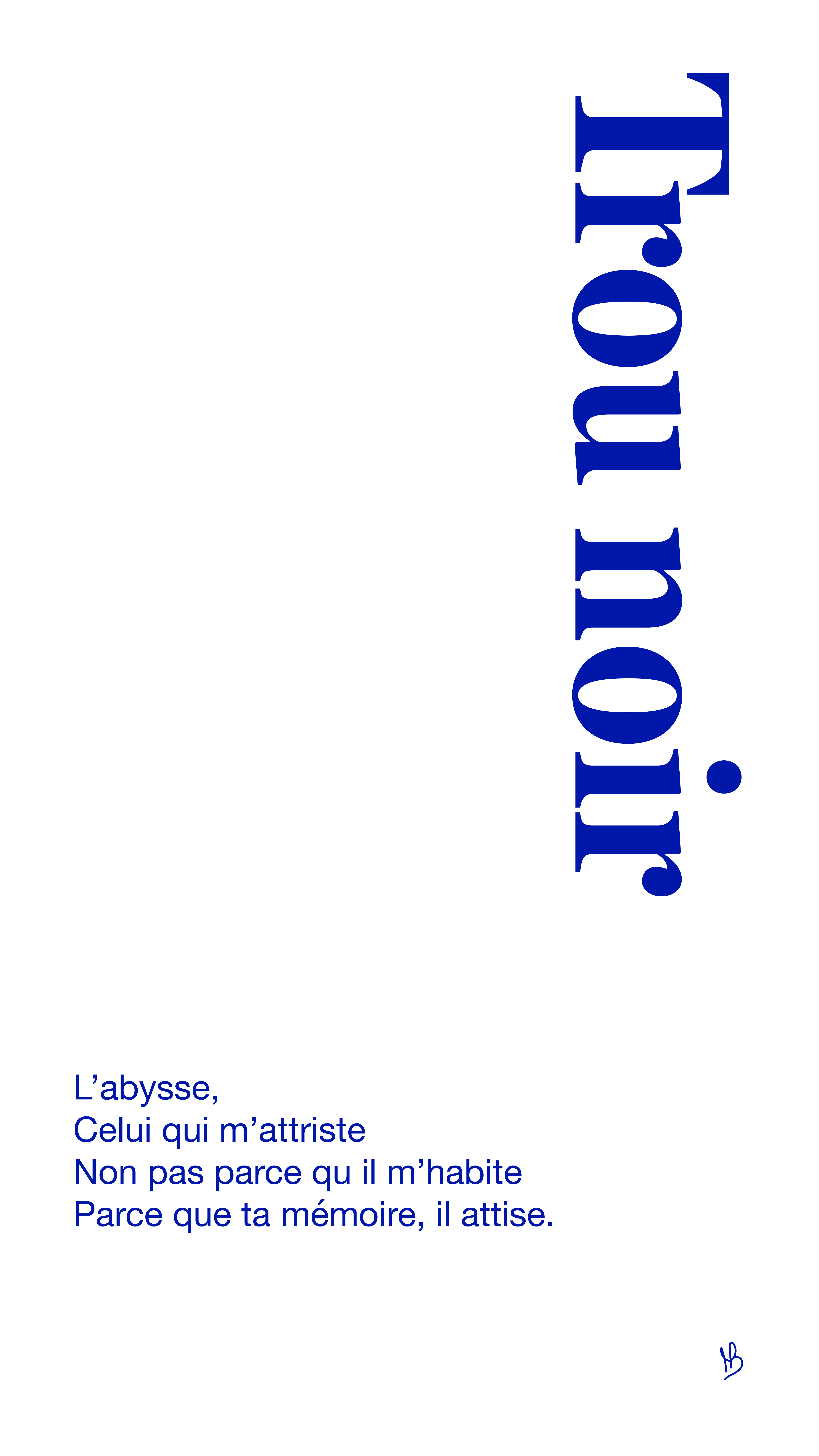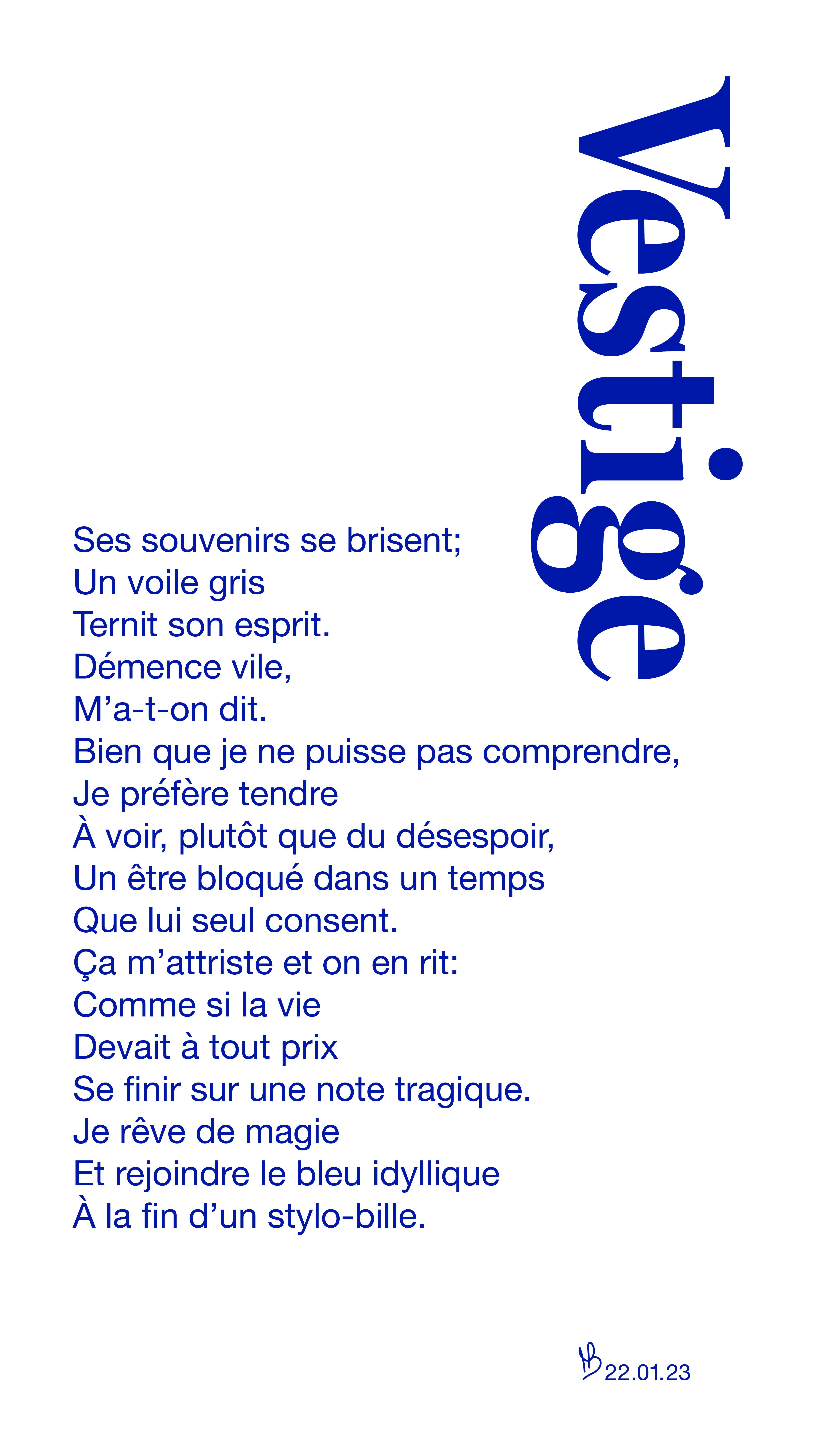 Libre de tout schéma de versification, j’aime jouer avec les mots, leur sens, leurs sons et connotations. Le bleu pour marque de fabrique s’associe au graphisme itératif pour davantage marquer l’esprit.